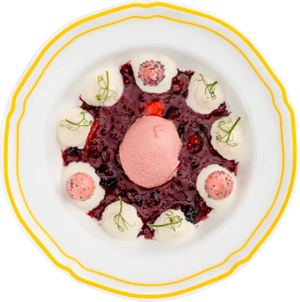 Zum Gericht Dessert Rote Grütze Rote Grütze, Kondensmilchschaum,