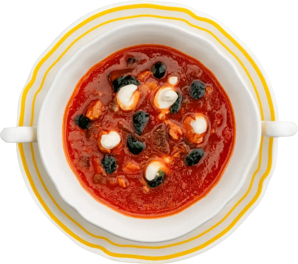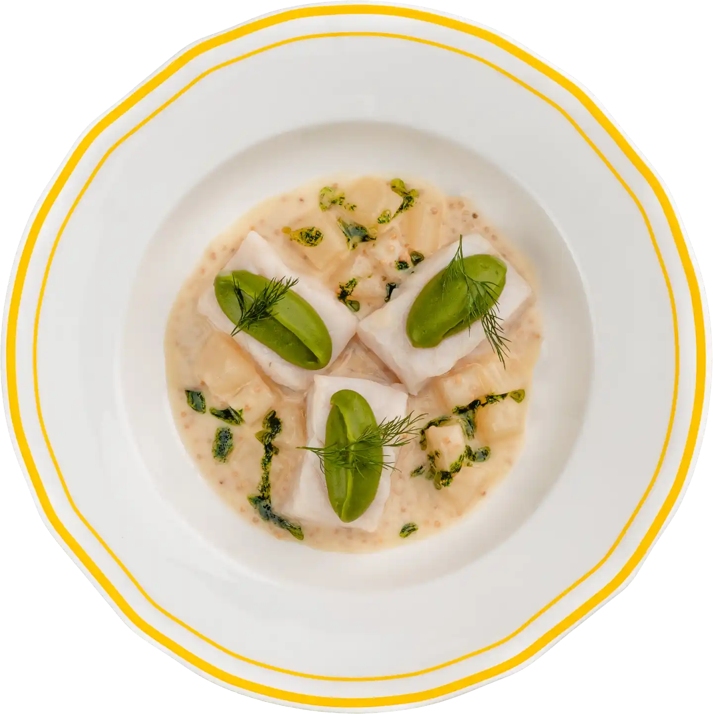 Gänge entdecken Soljanka Von Ost nach West Vorspeise Zander Sagohachi Hauptgang Rote Grütze Dessert ÜBERSICHT 49,00€ Soljanka, Sauerrahm & Dillöl Zum Gericht Soljanka Vorspeise Schmorgurken mit Senfsaat