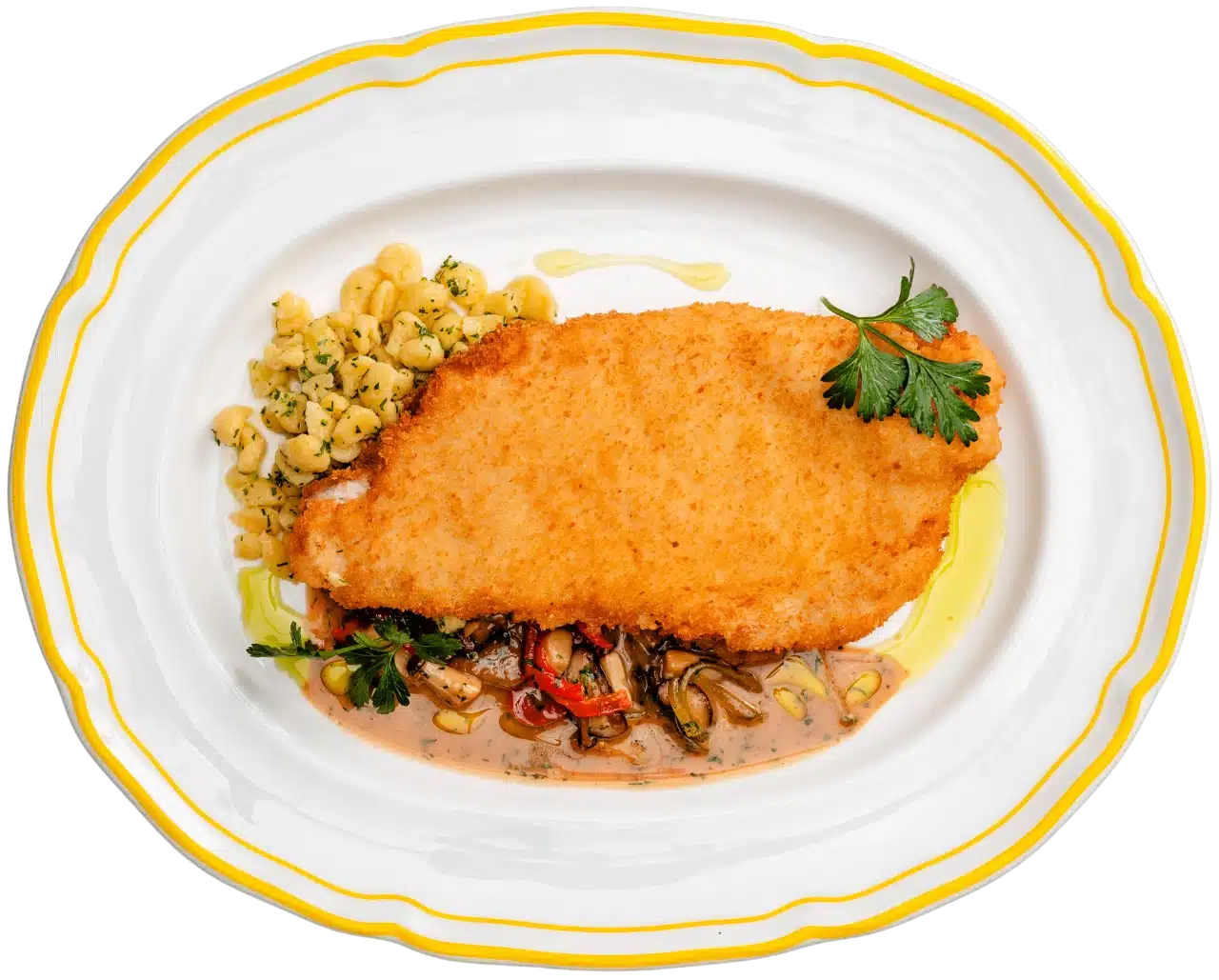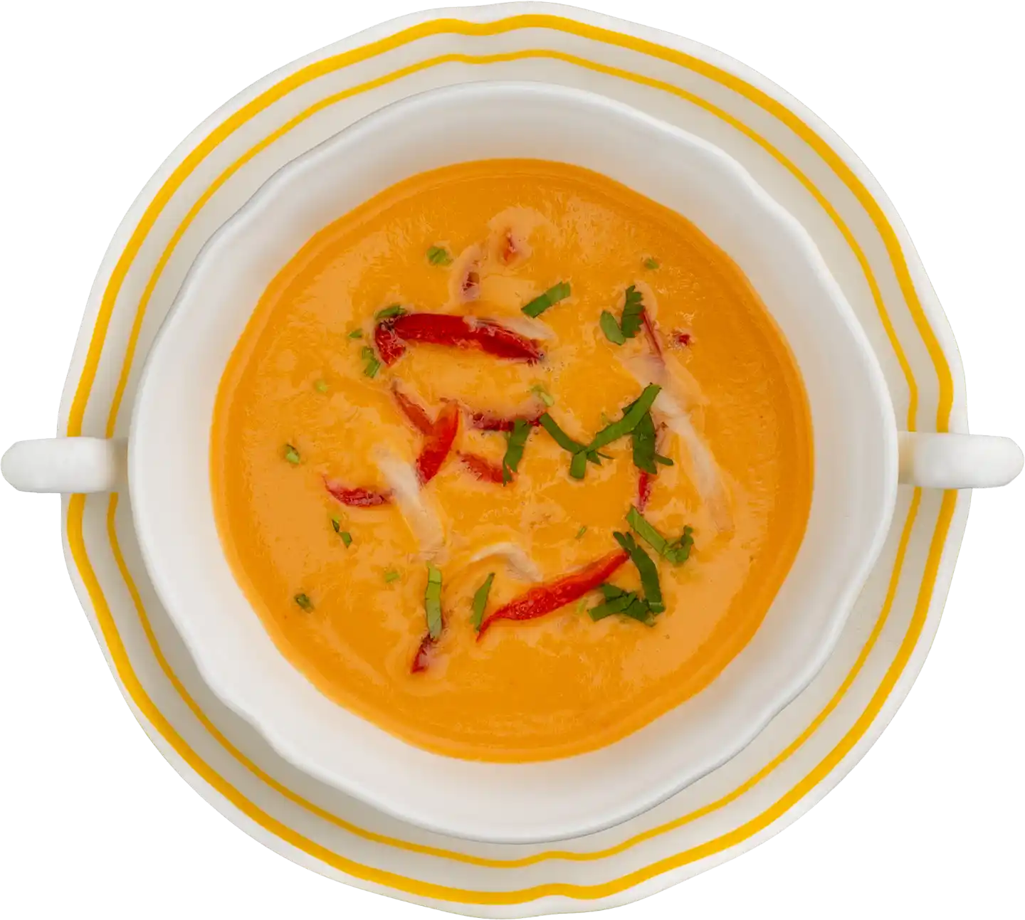 Gänge entdecken Kürbiscremesuppe Berliner Schnitzel Menü Vorspeise Berliner Schweineschnitzel Hauptgang Bananensplit Dessert ÜBERSICHT 44,00€ rote Paprika, Ingwer, Koriander Zum Gericht Kürbiscremesuppe Vorspeise Gewürzbutter, Kopfsalat,
